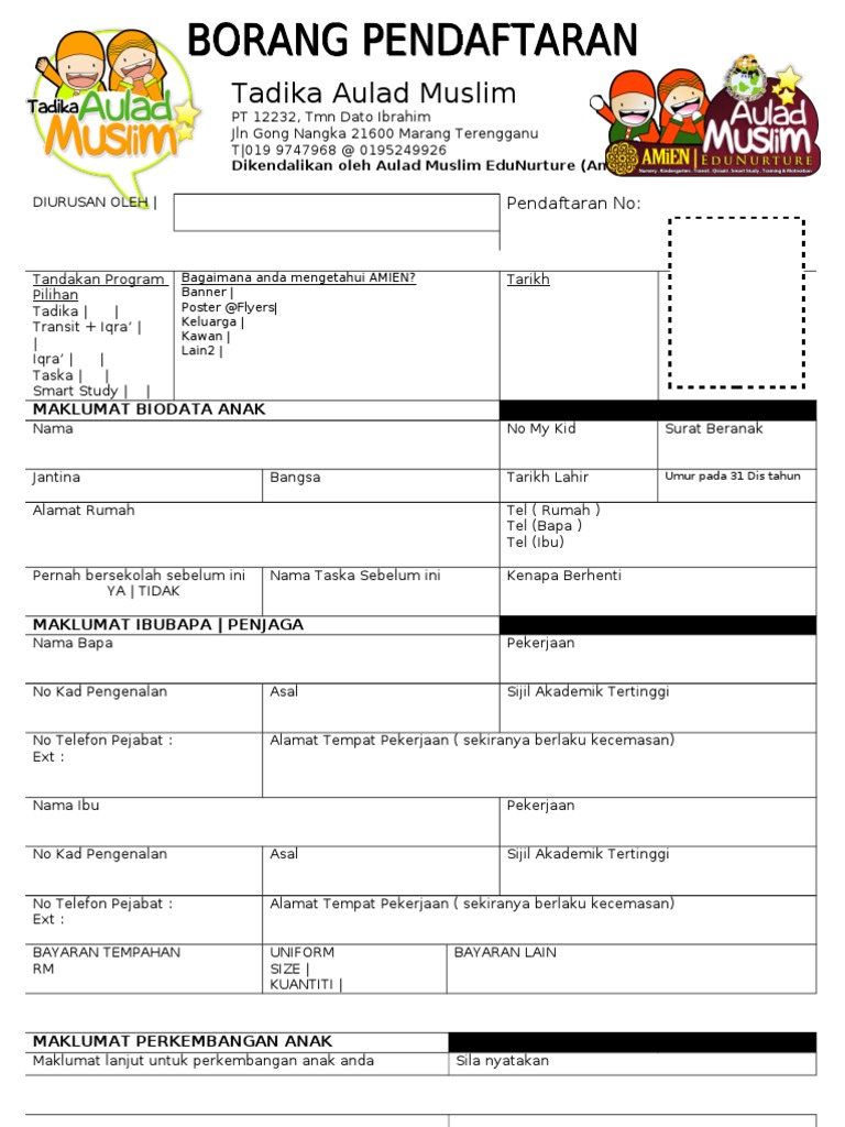 Contoh Borang Pendaftaran Tadika. Jangan lupa daftar anak masuk tadika. Pemohon dinasihatkan mencari premis yang berjauhan (melebihi 200 meter) dengan premis tadika swasta yang lain untuk mengelakkan lambakan di sesuatu tempat.