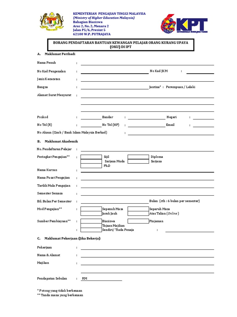 Borang Pendaftaran Bantuan Pelajar Oku Di Ipt from imgv2-1-f.scribdassets.com Borang pendaftaran individu r01 mssm. Pada pembentangan bajet 2012 yang lepas, perdana menteri telah bentangkan bajet. Borang permohonan cara daftar oku dengan isi borang bppoku pindaan untuk terima bantuan pendaftaran orang kurang upaya (oku) melalui jabatan kebajikan masyarakat jkm.