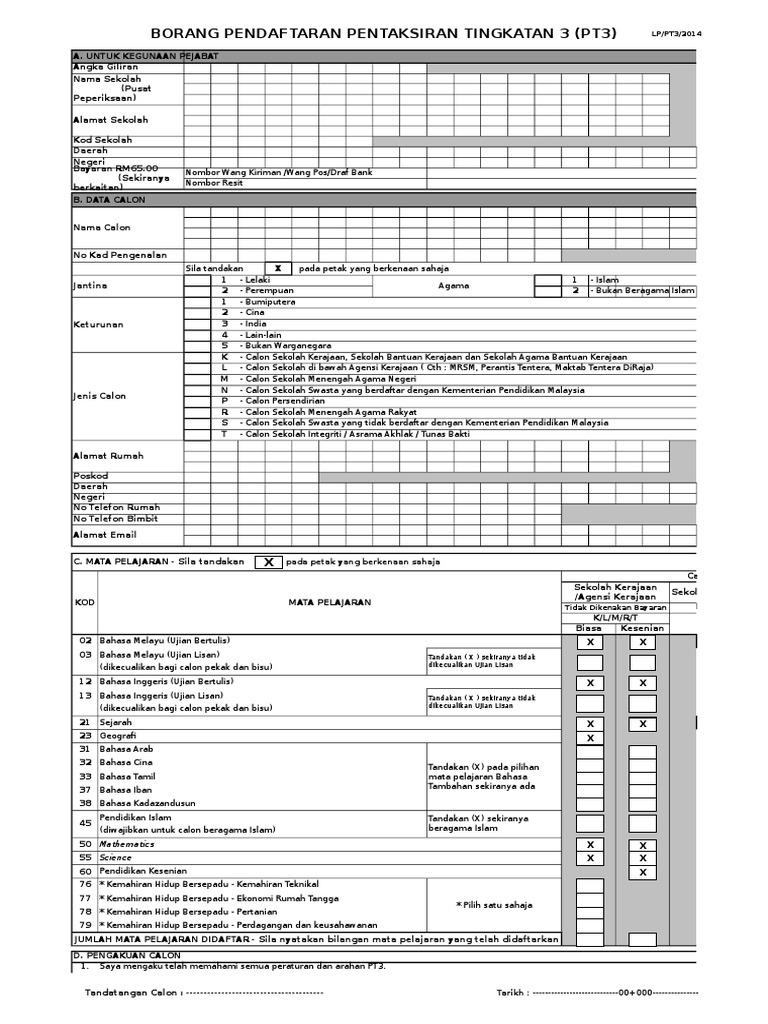 Jan 01, 2020 · panduan mengisi borang pendaftaran pentaksiran tingkatan 3, pt3. Calon hendaklah membaca semua arahan dengan teliti sebelum mengisi borang pendaftaran pentaksiran pt3. Borang pendaftaran calon upsr 2. Borang pendaftaran peperiksaan 2020 (untuk semua peperiksaan di atas, calon sekolah dan persendirian)