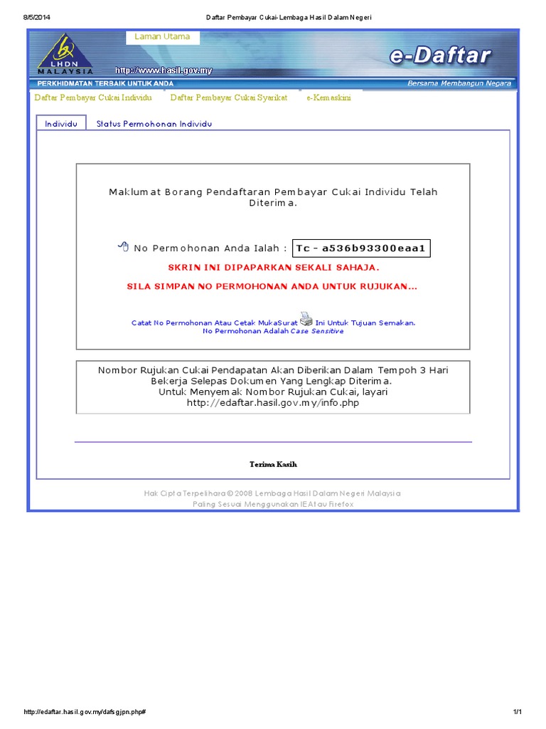 Lhdn Borang Pendaftaran Pembayar Cukai Individu. Klik butang <muat naik> untuk muat naik dokumen. Status permohonan pendaftaran pembayar cukai akan dipaparkan seperti di bawah.