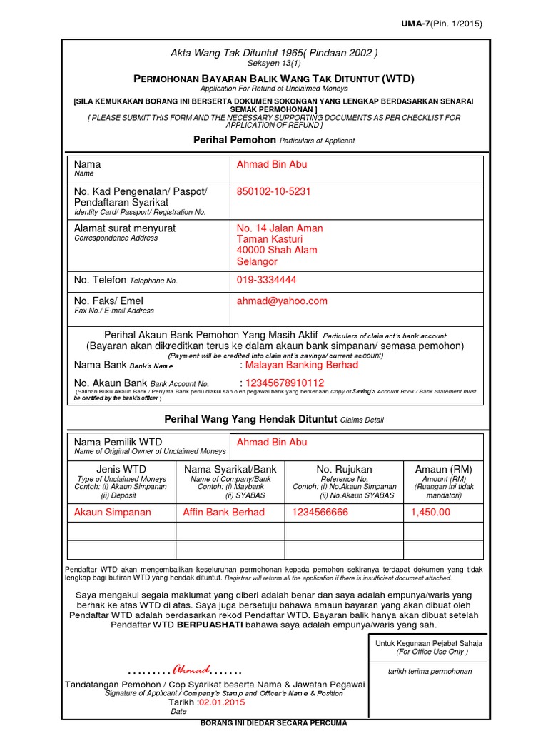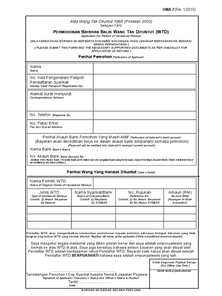 Borang Permohonan Wang Tidak Dituntut. Jika diluluskan, dan disahkan, anda akan terima bayaran balik wang tak dituntut ini terus ke akaun bank anda seperti dinyatakan dalam tempoh 30 hari. Aug 08, 2017 · borang permohonan wtd yang telah lengkap diisi, perlu dihantar ke pihak jabatan akauntan negara bersama dokumen sokongan.