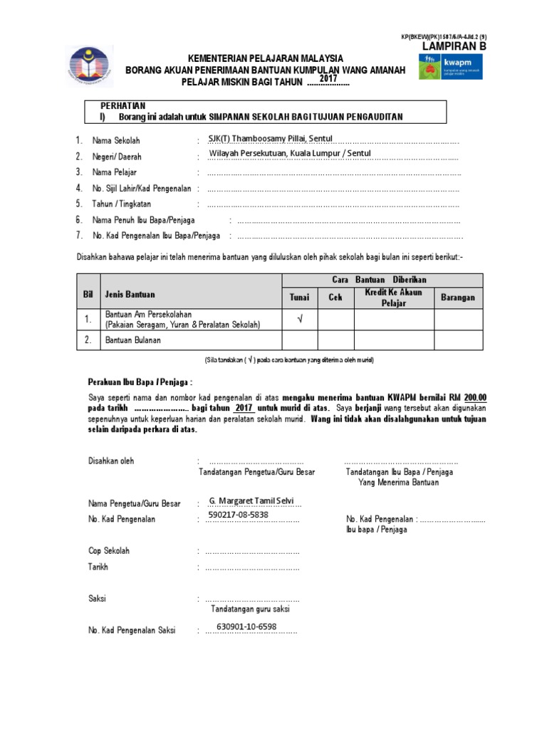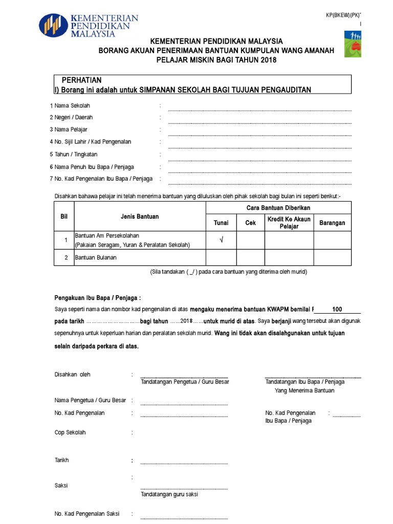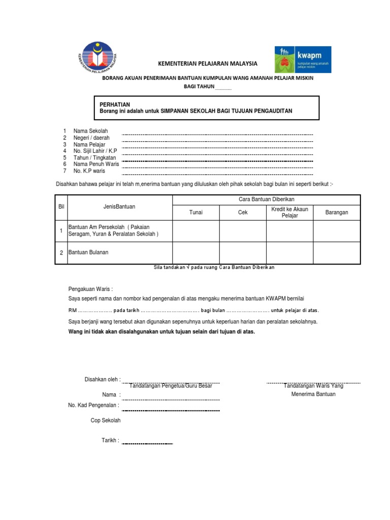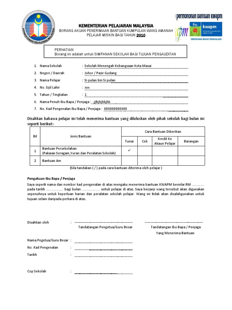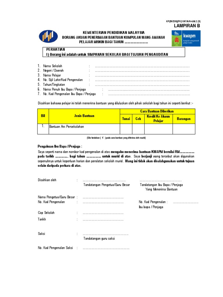 Borang akuan penerimaan kwapm. Borang kwapm b kementerian pelajaran malaysia borang akuan penerimaan bantuan kumpulan wang amanah pelajar miskin bagi tahun 2011. BORANG AKUAN PENERIMAAN BANTUAN KUMPULAN WANG AMANAH PELAJAR MISKIN BAGI TAHUN 2010.