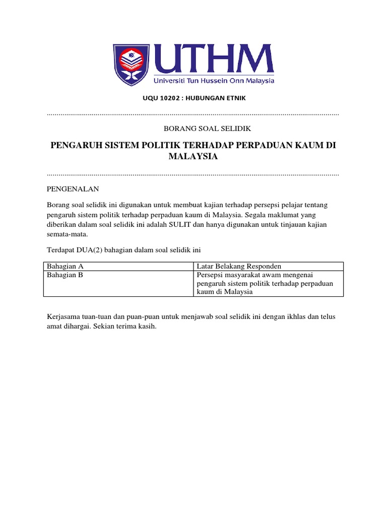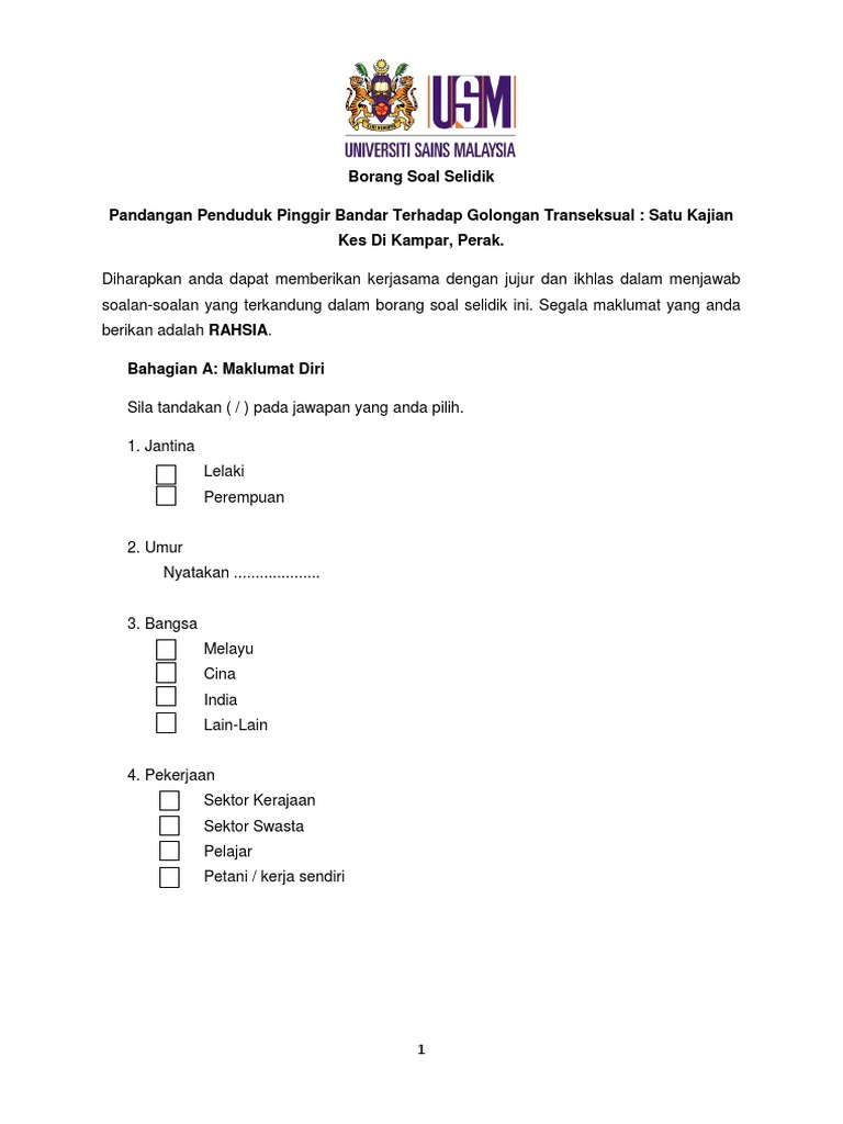 Borang soal selidik di malaysia. Soal selidik untuk mengkaji pembentukkan masyarakat majmuk melalui perkahwinan di kawasan sekitar Shah Alam. Kajian di sekolah sulit sila rujuk panduan pelaksanaan penilaian prestasi perkhidmatan awam malaysia sebelum mengisi borang ini borang uitm prestasi 52002 no. I pemeriksaan fizikal physical examination.