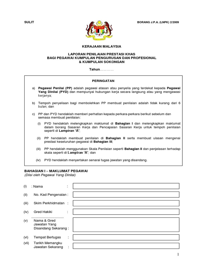 LNPK 22009 P YD hendaklah melengkapkan maklumat di Bahagian I dan melengkapkan maklumat dalam borang Sasaran Kerja dan. Borang J P A Lnpk 2 2009.