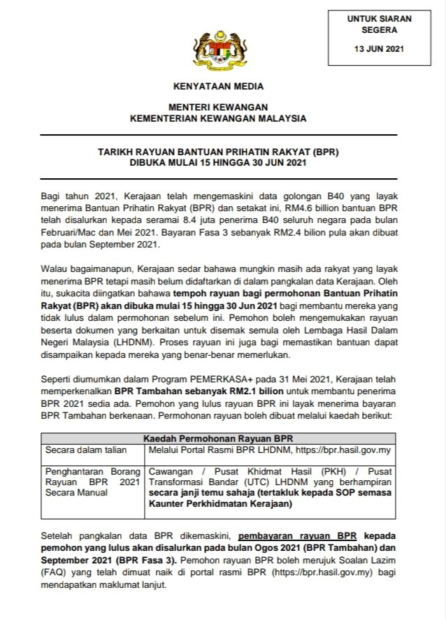 Ministry Of Finance On Twitter Kenyataan Media Yb Tzafrul Aziz Menteri Kewangan Berkenaan Tarikh Rayuan Bantuan Prihatin Rakyat Bpr Mulai 15 Hingga 30 Jun 2021 Https T Co Gurfayblmq