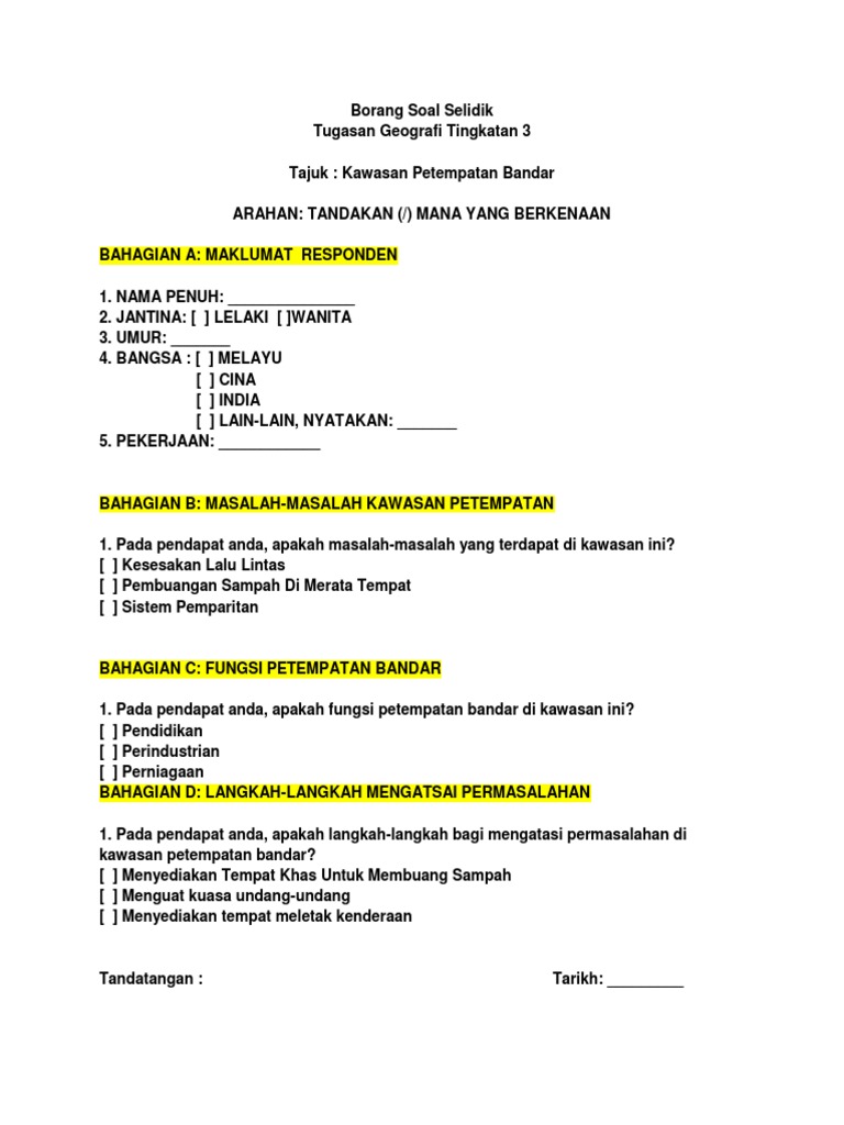 Bahan Rujukan Tugasan Geografi PT3 2015. Semua borang soal selidik geografi PT3 2015 yang telah pun dijawab oleh responden anda antara 10 hingga 20 orang wajib disertakan bersama-sama dengan tugasan Geografi PT3 2015 kali ini. Borang soal selidik tugasan pentaksiran tingkatan 3 geografi 2015 tajuk.