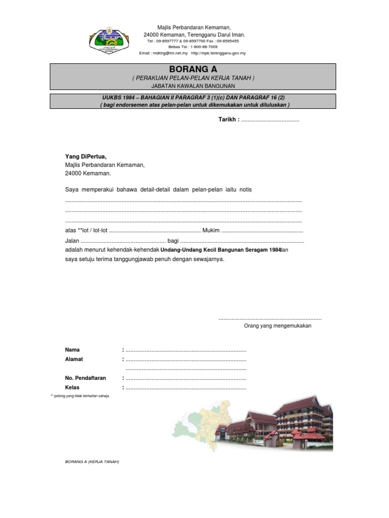 Borang Pengemukaan Borang B Kerja Tanah Borang B Kerja Tanah Borang KT-4 Pengeluaran Notis Memulakan Penyambungan Semula Kerja Tanah. 1 salinan surat kelulusan Kerja Tanah Muktamad daripada Jabatan Kejuruteraan MPS.