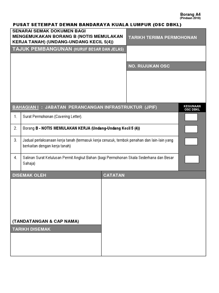 Untuk mengelakkan banjir kilat kerja tanah perparitan jalan perlu disiapkan mengikut spesifikasi sebelum kerja bangunan dimulakan. Borang B Kerja Tanah Dbkl - Senarai Semak Osc 1submission 18072013. Complete Borang B Dbkl within a few minutes by using the instructions below.