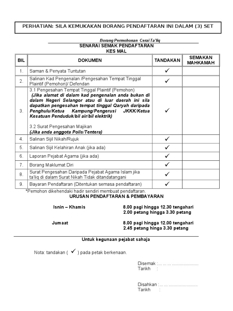 Borang fasakh selangor. Majlis Agama Islam Selangor Tingkat 9 10 Menara Utara Bangunan Sultan Idris Shah 40000 Shah Alam Selangor Tel. Sila sediakan dokumen-dokumen berikut sebelum pendaftaran. Tuntutan cerai secara fasakh ini dibuat atas alasan-alasan seperti berikut.