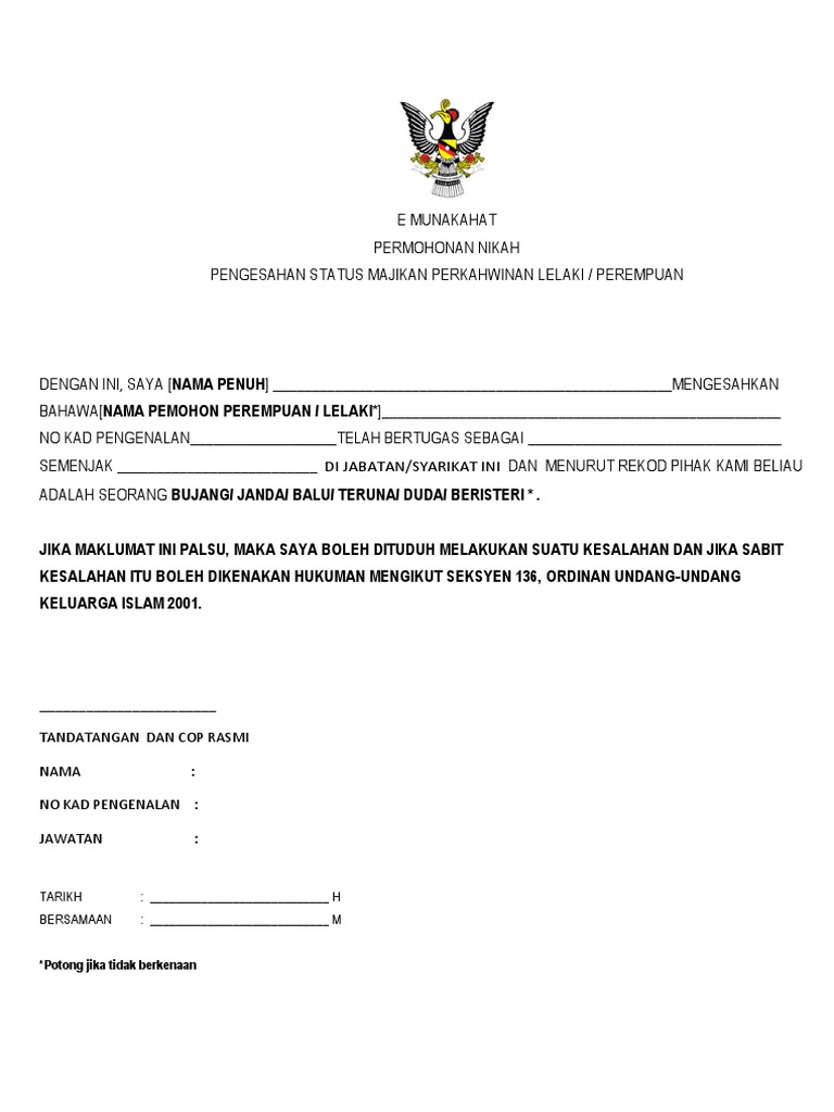 2 Ibu pemegang Kad Pengenalan Sarawak berstatus K atau isteri kepada pemegang Kad Pengenalan Sarawak berstatus K Sarawak Connection. Download mana yang perlu seperti Pengesahan Status Perkahwinan oleh Ketua Masyarakat Majikan dan Persetujuan Wali. Borang Nikah Terengganu Pdf.