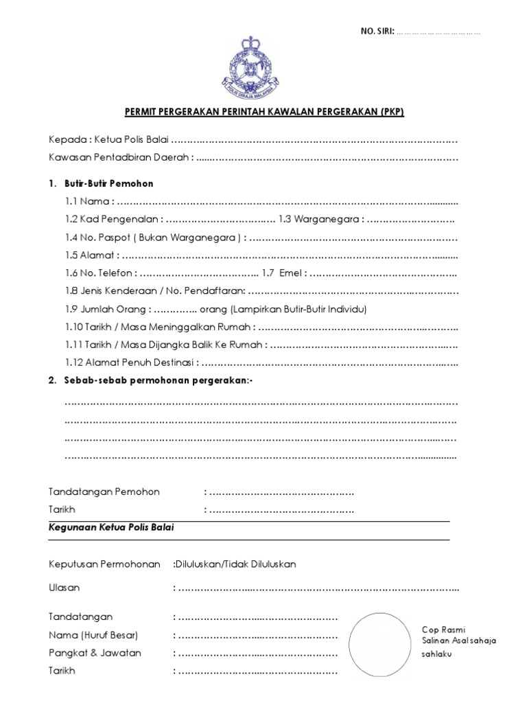 Surat Pkp - Surat Rentas Negeri Pkp 2021 Pdf Permohonan Rentas Negeri Pada Musim Pkp Dan Pkpb Kkm Cadang Rentas Negeri Sambut Raya Ditangguh. Bagi anda yang melakukan perjalanan ke kawasan atau daerah PKPD anda juga perlu mengisi borang permohonan rentas negeri sebelum dibenarkan masuk ke kawasan PKPD yang dikawal ketat dengan sekatan jalan raya SJR Borang Permohonan Rentas Negeri Terbaru 2021 Bagi memudahkan pemohon dan pihak PDRM pemohon perlulah memuat turun borang rentas. Bagi mana-mana individu yang ingin melakukan pergerakan rentas negeri atau daerah sepanjang tempoh PKP PKPB mulai 13 hingga 26 Januari 2021 anda dikehendaki mengisi Borang Permit Pergerakan PKP atau Borang Permit Pergerakan PKPB untuk mendapatkan kebenaran.