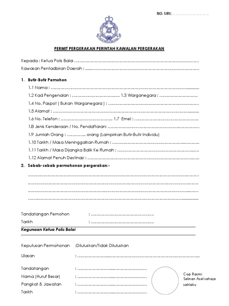 Senarai borang rentas negeri terkini melibatkan kawasan yang kena pkp 30 pkpp pkpb sila download contoh surat dalam format pdf untuk cara. Sepanjang tempoh PKP dan PKPB ini anda perlu dapatkan borang permit bagi tujuan rentas daerah atau negeri. Memang tengah panas sekarang ni search keyword berkaitan dengan cara mohon perlepasan kebenaran polis PDRM melalui borang permit rentas negeri dan download muat turun surat borang kebenaran rentas negeri atau.