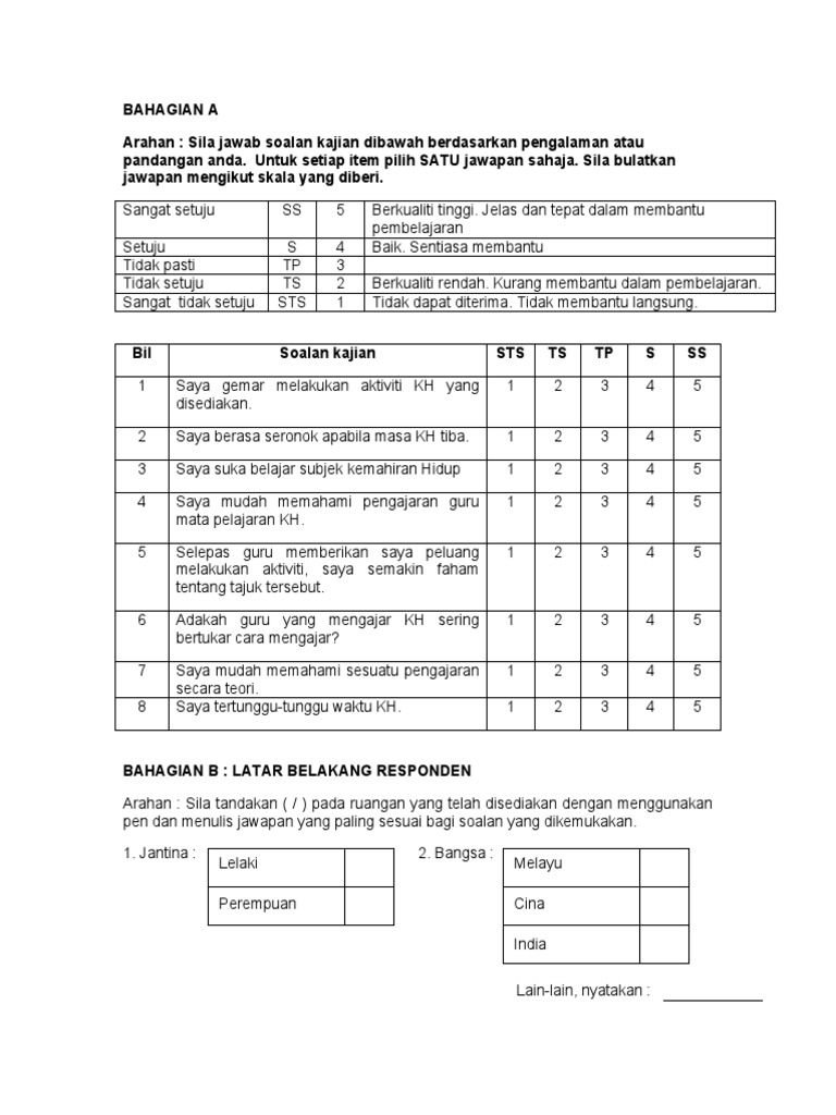 SOAL SELIDIK. Berikut soalan-soalan kajian yang sedang dilakukan oleh Kementerian Pelajaran Malaysia MOE berkenaan kesediaan pembelajaran secara online murid-murid yang kini bersekolah di sekolah-sekolah kerajaan. Borang soal selidik adalah berdasarkan kepada skala lima Likert iaitu sangat setuju SS setuju S tidak pasti TP tidak setuju TS dan sangat tidak setuju STS.