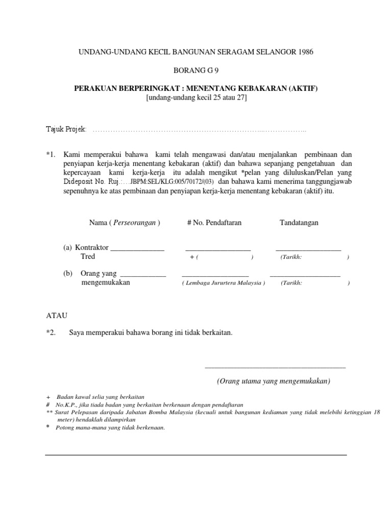 Notis menghapuskan bahaya kebakaran dibawah sub1atau melalui notis menghapuskan bahaya kebakaran kemudiannya dalam Borang B dalam Jadual Pertamamenghendaki orang yang disampaikan notis itu melakukan apa jua yang perlu bagi mencegah berulangnya bahaya kebakaran yang dimaksudkan olih notis itu danjika Ketua Pengarah fikirkannya wajarmenyatakan apa-apa kerja yang perlu. Borang b borang permohonan dan perakuan bagi pemasangan tetap dan sistem penggera kebakaran undang undang kecil 245 3 246 alamat jabatan bomba dan pembaharuan. Simpan Simpan Borang-I Borang Perakuan Bomba Untuk Nanti 0 0 menganggap dokumen ini bermanfaat Tandai dokumen ini sebagai bermanfaat 0 0 menganggap dokumen ini tidak bermanfaat Tandai dokumen ini sebagai tidak bermanfaat.